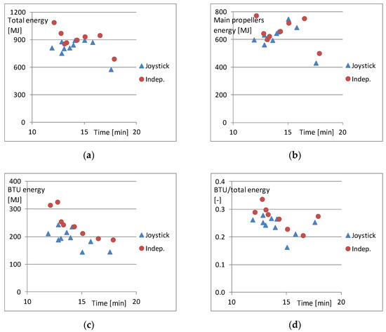 Taking into consideration the spread of the manoeuvres’ duration and its correlation to energy used (as presented in Figure 9), it should be noted that the interval 12 to 18 min, independently for both modes, seemed to be a matter of human operator control. Experts relied on their own experience and feeling in their self-assessment of safety and efficiency of the executed manoeuvre. The correlation of energy with time exists only for BTU (Figure 9c,d). BTU energy decreased with the increase in time, equally for both steering modes.