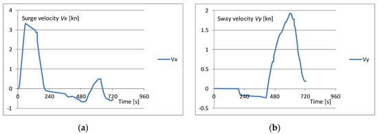 Figure 10 presents the basic kinematics of the manoeuvre in terms of linear/angular velocities and the ship’s positions, including its swept path. These kinematics data are presented in the paper only for the independent steering mode, case ‘ind #3’ (see Table 1), since they are similar and, thus, representative for other cases, also including joystick steering. With regard to the simulation scenario, due to data integration, the ship kinematics were not so much sensitive to instant steering orders.