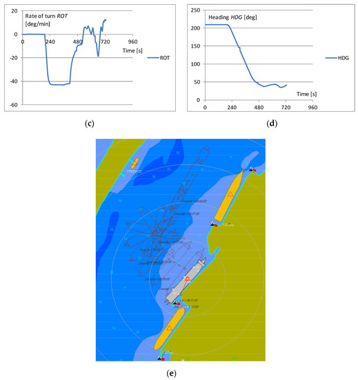 Representative time history of basic kinematic parameters of ferry test manoeuvre—independent steering case only (‘ind #3’): (a) surge velocity (kn); (b) sway velocity (kn); (c) rate of turn (ROT, yaw velocity) (°/min); (d) heading (°); (e) ship’s track (swept path) view at the instructor’s display.