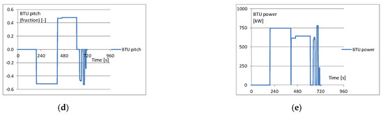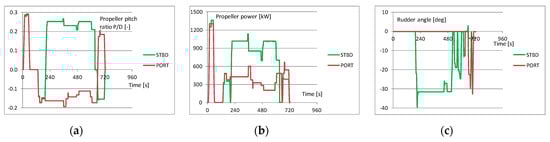 Representative time history of basic kinematic parameters of ferry test manoeuvre—independent steering case ‘ind #3’: (a) main propeller pitch ratios (–); (b) main propeller powers (kW); (c) rudder angles (°); (d) BTU pitch (fraction of max., i.e., ∈[−1; +1]); (e) BTU power (kW).