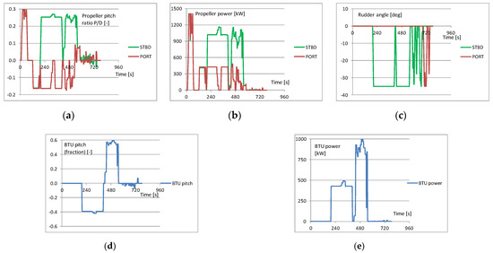 Representative time history of basic kinematic parameters of ferry test manoeuvre—joystick steering case ‘j/s #7’: (a) main propeller pitch ratios (–); (b) main propeller powers (kW); (c) rudder angles (°); (d) BTU pitch (fraction of max., i.e., ∈[−1; +1]); (e) BTU power (kW).