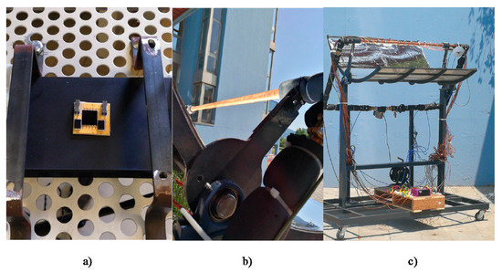 Experimental plant: (a) triple-junction solar cell; (b) cooling fluid circuit; (c) line-focus concentrating photovoltaic and thermal (CPV/T) system.