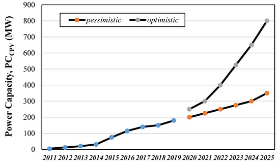 The cost reduction is due to an increasing diffusion of CPV systems during the years. The increase of the CPV power capacity () during the years from 2011 to 2019, together with two forecasts till 2025 referred to pessimistic and optimistic scenarios, respectively, is shown in Figure 2 [18]. Hence, in 2025, the CPV power capacity in Italy will be equal to 350 MW in a pessimistic scenario and to 800 MW in an optimistic one. By relating the CPV system cost reduction over years reported in Table 2 with the CPV power capacity () per year in Figure 2, it is possible to make a forecast on the values of over the years from 2020 to 2025 in the two scenarios defined. The results have shown that, for each category identified, the unit cost of the electric power supplied by a CPV systems will decrease as a function of the CPV power plant capacity in accordance with the following equation: