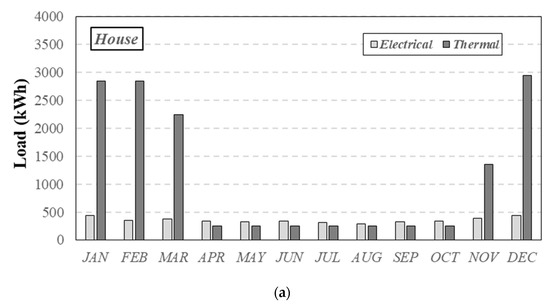 In this section, the electrical and thermal loads of the three above-mentioned users are defined (Figure 3). The smallest user is a house of 120 m2 inhabited by 4 persons (Figure 3a). It presents a peak electrical power of 3.3 kW and generally monthly electrical loads enough constant during the year. As for the thermal loads, they include the thermal energy necessary both for DHW and for WH.