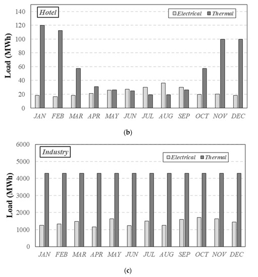Electrical and thermal loads of the three users defined: (a) house; (b) hotel; and (c) industry.