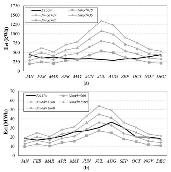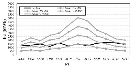 Because the annual hourly values of Tenv and DNI are available, it is possible to calculate, by means of Equations (6) and (7), the electric () and thermal () powers supplied by the CPV systems by varying its number of modules. Generally, it could be interesting to analyze the difference between CPV/T system outputs and energy loads of each user on a monthly basis when its number of modules varies. In Figure 4, the number of modules of the CPV/T system is varied to match the electrical loads of each user.