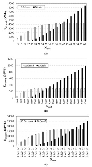 Trends of the annual electrical energy used and sold by varying the number of modules for the three users: (a) house; (b) hotel; and (c) industry.
