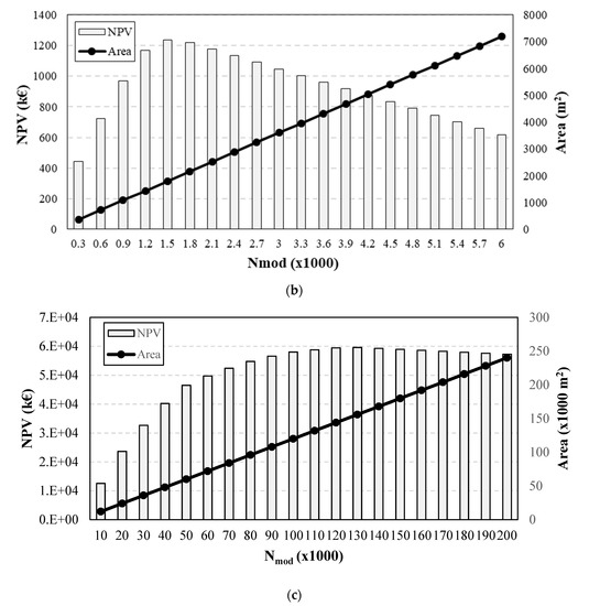 The calculated NPVs at the 20th year, average useful life for a CPV system, as a function of the number of modules are shown in Figure 7, together with the area required. It can be noted that, for each user, the NPV increases with the number of modules until it reaches its maximum value. A further increase in the CPV system size leads to a surplus electrical energy which is to be sold to the energy network at a price much lower than the purchase price, thus reducing cash flows. Moreover, an oversized system leads to a surplus of thermal energy, which constitute a loss. Hence, the optimal number of modules is 36 for the domestic user, with an NPV equal to 28.1 k€ and a necessary area of 43.2 m2; the optimal number of modules is 1500 modules for the hotel, with an NPV of 1237 k€ and an area of 1800 m2. The optimal number of modules is 130,000 for the industry, with an NPV of about 60,000 k€ and an area of 156,000 m2.