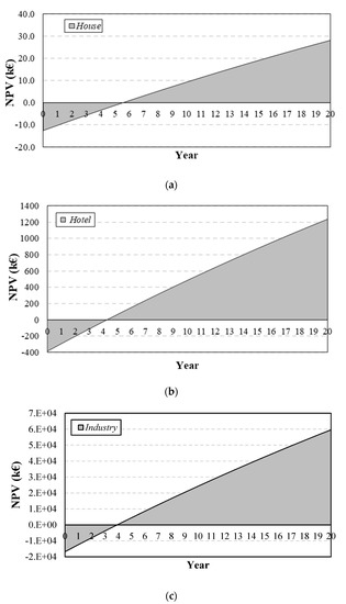 The NPV trends over the years in correspondence of the optimal number of modules for each user are shown in Figure 8. These trends allow evaluating the DPBP of the investment, which is equal to 6 years for the domestic user and are equal to about 5 and 4 for the hotel and the industry, respectively. The PIs are equal to 224% for the domestic user, 320% for the hotel, and 355% for the industrial user.