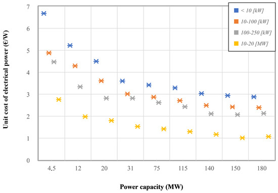 The economic analysis performed refers to the current costs of CPV systems. However, as reported above, because of the forecasted increase of the CPV power capacity (), a cost decrease of this technology is to be expected in the next years [19,20,21,22,23,24,25,26,27,28,29,30]. Hence, by relating the CPV cost reduction over years reported in Table 2 with the CPV power capacity () per year in Figure 2, it is possible to plot the trends shown in Figure 9 for the four categories previously defined. As shown in Figure 9, the high increase of the CPV power capacity during the years from 2011 to 2019 leads to a reduction in their unit cost of electrical power, which can be described by means of Equation (9). The values of coefficients γ and δ in Equation (9) are reported in Table 5 for each category defined of the CPV system, together with the values of .