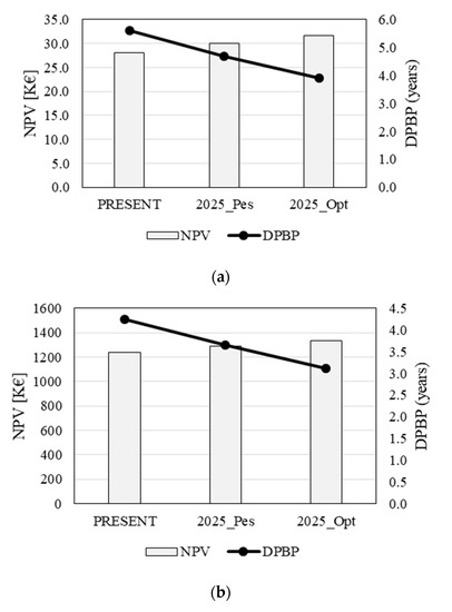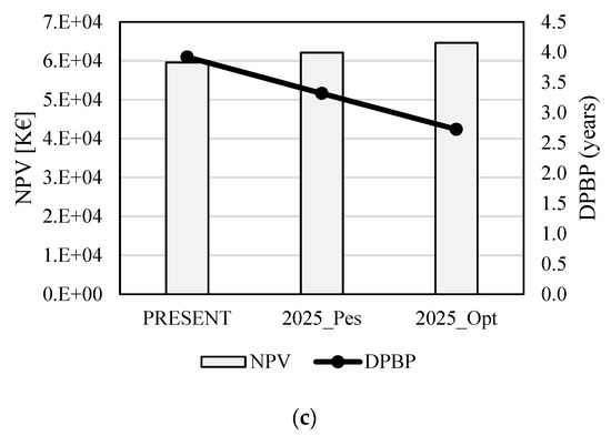 As shown, according to the cost forecasts, CPV systems will become more convenient in 2025. In fact, for the CPV systems adopted for the residential user (Figure 10a), the NPV will increase from 28.1 k€ to 30.0 k€ in a pessimistic scenario and to 31.7 k€ in an optimistic scenario, while the DPBP will decrease from 5.6 years to 4.7 and 3.9 years in a pessimistic scenario and an optimistic scenario, respectively. As for the hotel (Figure 10b), the NPV will increase from 1237 k€ to 1289 k€ in a pessimistic scenario and to 1337 k€ in an optimistic scenario, while the DPBP will decrease from 4.2 years to 3.7 and 3.1 years in a pessimistic scenario and an optimistic scenario, respectively. Finally, as for the industrial user (Figure 10c), the NPV will increase from 59,578 k€ to 62,090 k€ in a pessimistic scenario and to 64,603 k€ in an optimistic scenario, while the DPBP will decrease from 3.9 years to 3.3 and 2.7 years in a pessimistic scenario and an optimistic scenario, respectively.