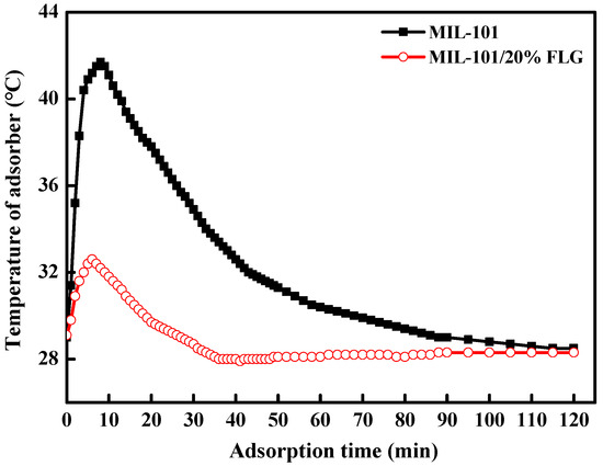 The temperature characteristic curves of MIL-101 and MIL-101/20%FLG adsorbers during the adsorption process were measured at an ambient temperature of 25–30 °C, adsorption temperature of 25–30 °C, evaporation temperature of 17 °C and adsorption time of 120 min, with the results shown in Figure 4.