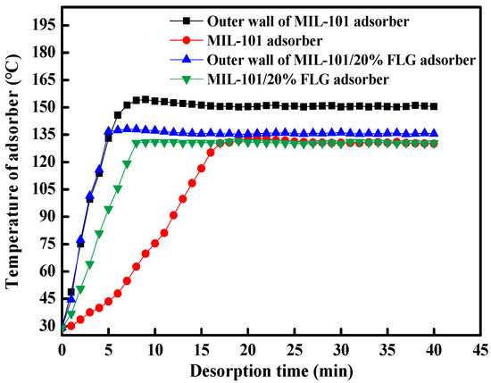 As seen from Figure 5, when the final central temperatures in MIL-101/20%FLG and MIL-101 adsorbers are both ~130 °C, the outer wall temperature of MIL-101/20%FLG and MIL-101 adsorbers is stable around 135 °C and 151 °C, respectively. The heating time of MIL-101/20%FLG adsorbers from 29.0 °C to 130.5 °C is 8 min with a heating rate of 12.69 °C min−1, which is 2.24 times as much as that of MIL-101 adsorbers (heating rate of 5.67 °C min−1, heating time from 28.7 °C to 130.8 °C is ~18 min), and the heating time is shortened by 55.5%. The heat transfer temperature difference between the central and outer wall of MIL-101 adsorbers is about 21 °C, while between the central and outer wall of MIL-101/20%FLG adsorbers, it is only 5 °C and is significantly decreased by 76.2%. This is due to the fact that a thermal conductive channel can be formed within the MIL-101/FLG composite by adding FLG into MIL-101, which improves thermal conduction performance of MIL-101 adsorbers, and the thermal contact resistance between MIL-101 particles is reduced. Therefore, the heat transfer of MIL-101 adsorbers could be effectively improved by adding FLG during the heating desorption process, which would be beneficial to reduce desorption time.