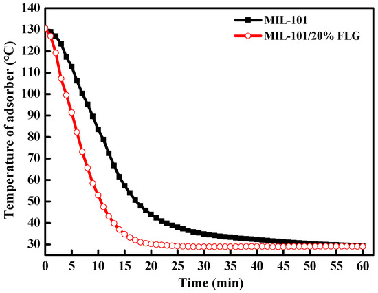 At an initial temperature of ~130 °C and final temperature of ~29 °C, the temperature drop curves of MIL-101 and MIL-101/20%FLG adsorbers were measured in the cooling process. The results are shown in Figure 6.