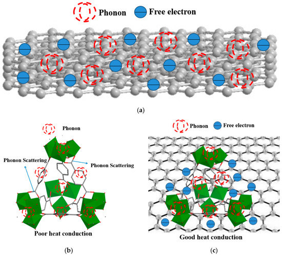 Schematic diagram of structure and heat conduction mechanism for (a) FLG, (b) MIL-101 and (c) MIL-101/FLG composite.