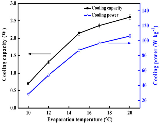 As seen in Figure 8, the cooling capacity and SCP of the system is 2.14 W and 87.5 W kg−1 at an evaporation temperature of 15 °C, which is 3.06 times that of an evaporation temperature of 10 °C (0.70 W and 28.6 W kg−1). Raising the evaporation temperature to 17 °C and 20 °C, the cooling capacity and SCP of an MIL-101/20%FLG-water working pair just increases by 10.3% and 10%. This is due to the fact that the evaporation pressure of refrigerant (water) rises, and the mass transfer impetus of water on MIL-101/20%FLG increases with the rise of evaporation temperature. Results show that the MIL-101/20%FLG composite is more applicable to an adsorption water chiller application [12,35] with an evaporation temperature of 15–20 °C.