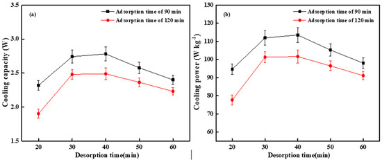 As shown in Figure 10, the cooling capacity (a) and SCP (b) rapidly increase below a desorption time of 30 min due to the fast desorption rate, while the cooling capacity of the system is 2.74 W and 2.48 W at adsorption times of 90 min and 120 min, respectively. Prolonging the desorption time to 40 min, the cooling capacity of the system is 2.78 W and 2.49 W at adsorption times of 90 min and 120 min, respectively. However, there is no obvious improvement of cooling capacity at a desorption time greater than 40 min. When desorption time is in the range of 30–40 min, the SCP of the MIL-101/20%FLG-water working pair reaches its maximum of 113.5 W kg−1 at an adsorption time of 90 min. Along with desorption time further increasing, the SCP significantly declines. Therefore, the suitable desorption time of an MIL-101/20%FLG-water working pair is 40 min, which is shortened by 33.3% compared to an MIL-101-water working pair with a desorption time of 60 min (as shown in Figure S6). This is attributed to the higher thermal conduction of MIL-101/20%FLG compared to MIL-101, resulting in a faster heating rate and shorter heating time; thus, the desorption rate is increased and desorption time is decreased.