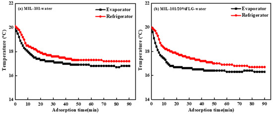 It is shown in Figure 11 that during the cooling process, the temperature drop the of evaporator and refrigerator for MIL-101/20%FLG-water working pairs is 3.6 °C and 3.3 °C, respectively, which means chilled water of 16–20 °C might be produced.