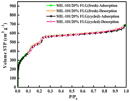 The XRD patterns of fresh MIL-101/20%FLG and cycled MIL-101/20%FLG are shown in Figure 13, while N2 adsorption/desorption isotherms and pore structure parameters are shown in Figure 14 and Table 2, respectively.