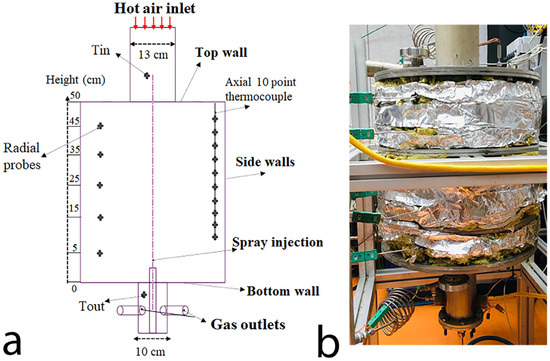 Schematic overview of the reactor depicting inlet, outlet, walls, and probes locations (a) and lab-scale counter-flow spray dryer (b).