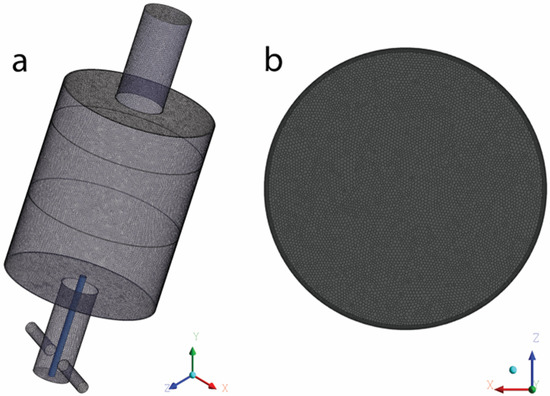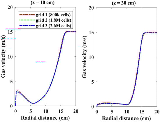 The computations were performed using a polyhedral mesh of 800 k cells, 1.8 M cells, and 2.6 M cells. The grid independence of the solution was ensured by comparing the velocity profile along the radial distance, at two different axial heights of the dryer. Figure 2 shows negligible differences for all three grid sizes; however, some small discrepancies can be seen for grid 1 in the outer region and in the central core region, while almost no difference is observed between grid 2 and grid 3. Therefore, grid 2 with 1.8 M cells was selected and used for all future simulation cases. The final mesh is shown in Figure 3.