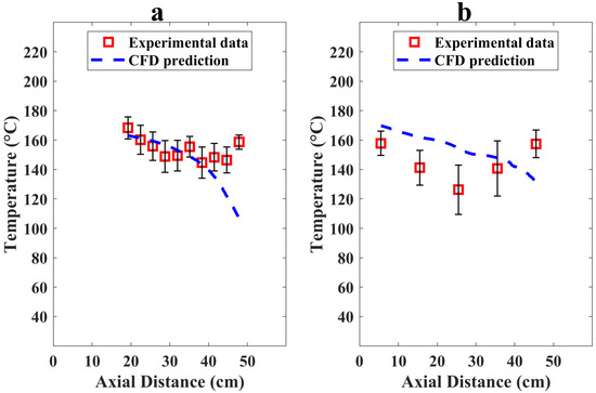Comparison of experimental temperature measurements and CFD model predictions, at the single axial probe (a), and at five radial probes (b).