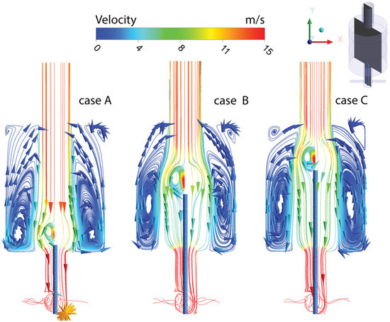 Air streamlines across the central axial cross-sectional plane (XY) for three different nozzle locations, A = 3 cm (left); B = 23 cm (middle); C = 33 cm (right) (to introduce more clarity, the maximum value of the velocity has been restricted to 15 m/s).