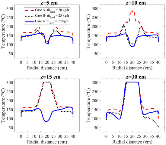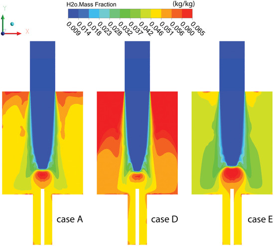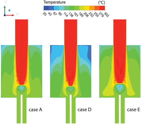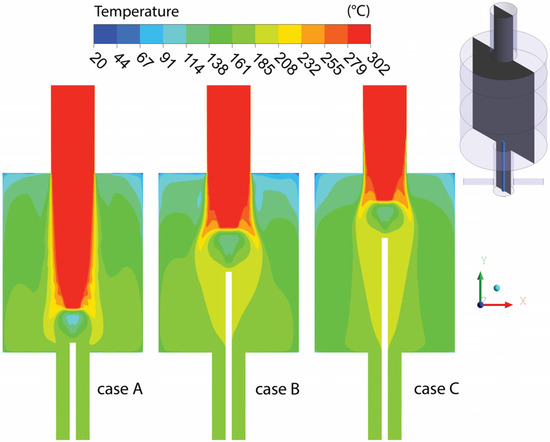 The temperature patterns (Figure 7) show high air temperatures concentrated in the central zone and a moderate temperature mixing zone extending radially outwards to the walls of the dryer. The highest heat and mass exchange occurs close to the atomizer as a result of high-temperature gradients and the high relative velocity of droplets/particles to the air velocity. Moreover, along the top wall of the dryer, relatively low air temperatures are seen for cases B and C compared to case A, mainly due to the bigger-sized droplets directly impinging and evaporating in that region (45–50 cm).