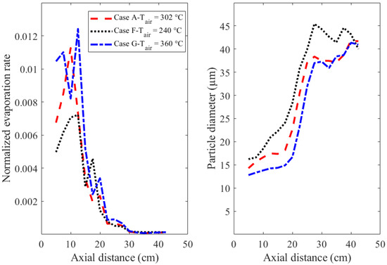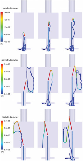 This is further shown in Figure 8, where the particle trajectory for three different diameters, 14 µm, 61 µm, and 97 µm, is plotted for all three cases. The smaller/fine droplets are dried instantly close to the atomizer, and due to their low Stokes number (<0.1) and small relaxation time, they are instantly entrained in the counter flow air and leave the reactor via the outlet. The larger particles (61 and 97 µm), due to their big momentum, penetrate further into the chamber and are more likely to escape the central core flow and impact the side walls or top-side walls (40–50 cm) of the dryer. These particles, depending on their respective trajectories, eventually either impinge the bottom wall where they deposit or are trapped in recirculation zones and leave later via the outlet.