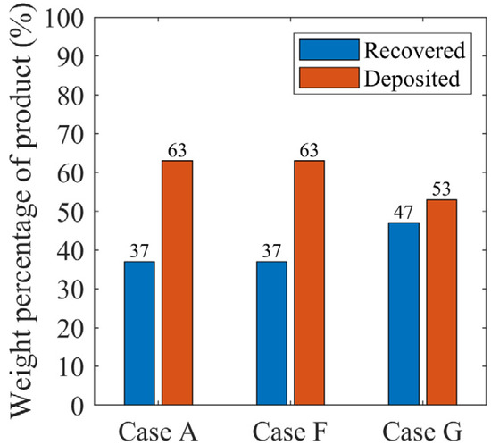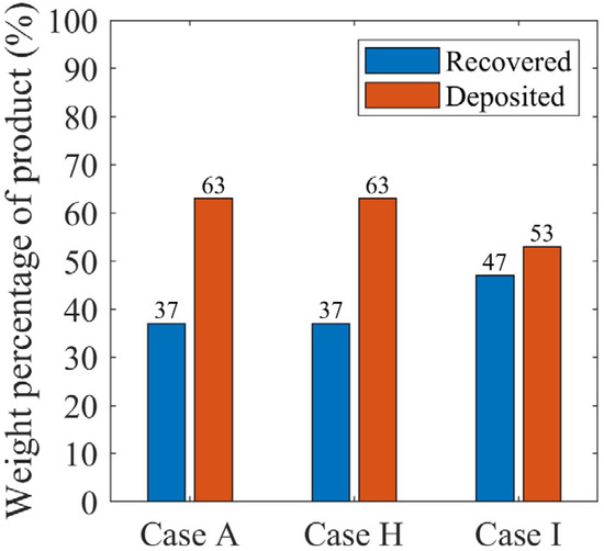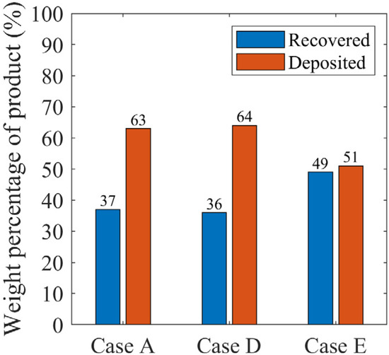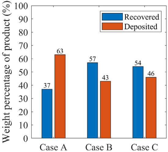 As a consequence of moving the nozzle forward in the chamber, dried skim milk particles have a higher chance to be picked up by the recirculation zones and therefore do not directly impinge the bottom wall. This is depicted in Figure 9, where case B (nozzle at 23 cm) resulted in a minimum product deposition of 43 wt.%. For case C, when the nozzle is at 33 cm, the droplet’s/particle’s momentum is too high for counter-flowing air to deflect them downwards. These bigger-sized droplets/particles (>90 µm) further enter the air inlet section. This is highly undesirable since milk droplets/particles can deposit on the inlet walls leading to milk burning or causing an explosion.