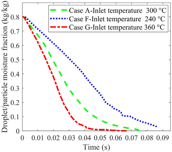 For all simulation cases, a hollow cone spray pattern is used. The droplet size distribution is prescribed at a distance of 2 cm from the nozzle tip (indicated in Figure 1b). The location is based on the droplet size and velocity measurements obtained experimentally using the Particle Droplet Image Analysis technique reported in a separate study [44,45]. The droplet size is fitted to the Rosin Rammler size distribution function using the values of mean diameter and spread parameter, as shown in Table 1. The value of the spread parameter was estimated to be 1.7, which is in the range of values proposed by Lefebvre [56], and also reported by Kievet [26]. The droplet/particle dispersion caused by the turbulence is accounted for using the discrete random walk model [57]. It has been reported that the reflecting droplet/particle-wall boundary condition corresponds more closely to the practical results and observations [6,32]. Following the methodology proposed by Ali et al. [6], the normal and tangential restitution coefficients are a function of droplet/particle moisture content. Assuming the restitution coefficient of the initial wet droplet as 0 and completely dry particle as 0.2 [15], the following relationship is prescribed for calculating the restitution coefficient: