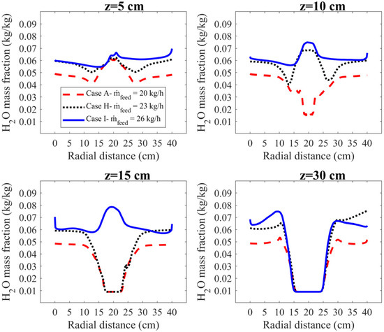 To ensure a stable solution, initially, gas-only flow is established. Once a stable, converged flow is achieved, the discrete phase is introduced in the domain. For convergence, several monitoring points (temperature and velocity) were placed inside the domain at different radial and axial locations. Furthermore, a converged solution was ensured when the target normalized residual values were in the order of 1 × 10−5 for continuity and energy and 1 × 10−4 for all other transport equations. Finally, mass-weighted average gas temperature and water mass fraction were monitored at the gas outlet. The errors in the mass and energy balances at the end of the simulation were less than 0.01%.