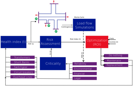 OFGEM, Great Britain’s independent energy regulator, published a common framework [13] for Distribution Network Operators, where the methodology for risk assessment is addressed, including the estimation of health index, probability of failure, and monetization of criticality throughout time. However, in this framework, methodologies for supporting optimal decision making and the use of historical condition records for forecasting asset condition are not addressed, and the major of the variables are estimated using the operation conditions of Great Britain. A global asset management approach has been introduced in the project PRIAD [14] by Hydro-Quebec, proposed to develop an asset management decision support tool in order to ensure utilities’ sustainability and performance [15]. This plan considers developing modules for data warehouses, asset behavior, reliability, transmission system simulator, risk, and optimization, while considering the decision-making process in a holistic way. These modules are currently under development and just consider maintenance strategies. Additionally, the methods to optimize the maintenance strategy are currently under investigation. Finally, in [2], approximations performed by different utilities are presented, where the importance of risk assessment using estimations of probability of failure and critically can be concluded. However, the lack of both consensus for the definition of asset index and decision-making optimization methodologies can be evidenced.