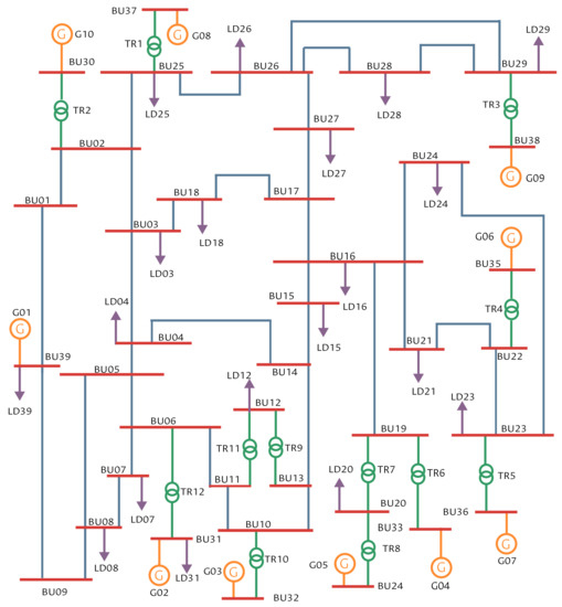 The IEEE 39 Bus System is composed of 19 loads, 10 generators, 34 lines, and 12 power transformers. The system topology is shown in Figure 3. The rating of power transformers and lines was assumed constant, making a conservative assumption. In other words, dynamic rating was not considered.