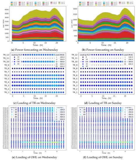 As security margins, a conservative loading less than 100 for lines and transformers was assumed, and to simplify, dynamic ratings were not considered. For buses, the voltage limits are from 0.9pu–1.1pu. In Figure 4c,d, it can be appreciated that the transformers TR_1, TR_3, TR_4, TR_5, TR_6, and TR_10 are close to 50 of their loading during load peak operation. Additionally, by these transformer flows, the maximum peak power is close to 500 . Figure 4e,f shows the loading of lines. Here, it can be appreciated that the LN_16_19 is operating close to its security margin with a power flow near 500 . Finally, Figure 4g,h shows the voltage assessment where Bus_36 and Bus_33 are close to their upper limit.