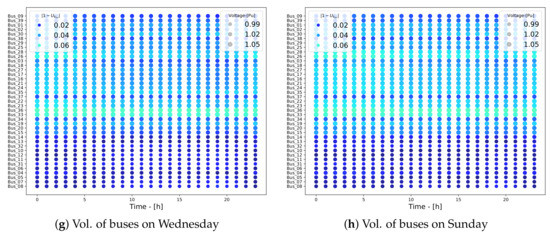 The operating conditions of the assumed power system during the first week of the period of planning are shown in Figure 4. These conditions were computed following the procedure proposed in [22]. Figure 4a,b shows the assumed load profiles for each of the 19 loads on Wednesday and Sunday. These are considered as the days with a higher difference in the load patterns. The load profiles were approximated using Fourier series, such as addressed in [23]. The loading of the transformers and lines as well as the voltages of the buses were computed using the pandapower tool [24] by running load flows at each hour.