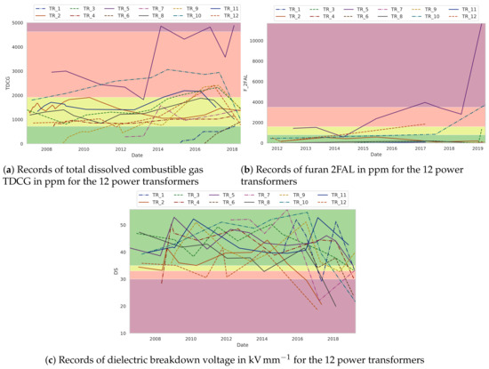 To assess the condition of the transformer fleet, historical diagnostic records of a local utility were used. Figure 5 shows the records of total dissolved combustible gas (TDCG), the furan 2FAL, and the dielectric breakdown voltage (DS). In particular, Figure 5a presents the assessment of TDGC using the IEEE Std C57.104™-2008 [25], and it can be noted that the condition of TR_5 indicates that the transformer has been heavily overloaded, and/or an arc has occurred inside. A similar behavior of this transformer is shown in the records of the furan 2FAL. According to Figure 5b, the transformers TR_3, TR_10, and TR_12 present a historical increasing rate of the furan 2FAL. Finally, the records of dielectric breakdown voltage are shown in Figure 5c. These records were assessed according to IEEE Std C57.152™-2013 [26] and demonstrate that almost all of the transformer fleet is outside of the acceptable margin, and an accelerated degradation of the assets can occur in the lifetime.