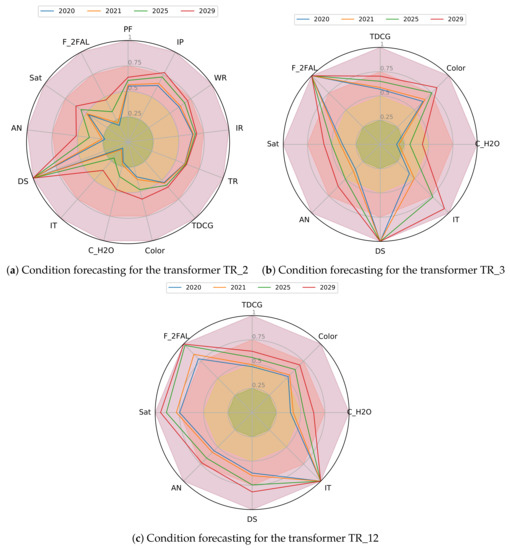 In order to estimate the transformer health index, each condition assessment is normalized from 0 to 1, where 0 is the score with the best condition, or as new, and 1 is the worst condition score. To illustrate, a value of dielectric breakdown voltage greater than 55 will be scored with 0 and a value close to 0 will be scored with 1, using the IEEE Std C57.152™-2013. Additionally, considering that the condition records are reported on different dates, a curve fit using (8) is performed in order to predict the asset condition. Hence, the normalized condition of power transformers is assessed using the tables reported in [27], and the curve fit is performed using the condition records and the Python library SciPy [28]. With these normalized conditions, the health index is computed using Equation (1). To illustrate this procedure, the normalized conditions of transformers TR_2, TR_3, and TR_12 are predicted for the years 2020, 2021, 2025, and 2030 and exposed in Figure 6. These dates correspond to the assumed periods for planning maintenance (2020), refurbishment (2025), and replacement (2030) of a power transformer fleet. Here, it can be appreciated that the transformers present differences in the number of diagnostics tests, i.e., by the current policies of maintenance of the asset owner by which the kind of diagnostic for each transformer is defined.