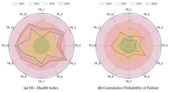 Subsequently, the rate of failure is estimated with (2) using the health index. The constants assumed to estimate are shown in Table 3. However, these constants should be estimated with both condition and failure records of the utility when the data are available. Finally, once the failure rate is calculated, the reliability and therefore the probability of failure are computed. In Figure 7a, HI predictions are shown, whereas Figure 7b pictures the cumulative probability forecast of failure for each asset.