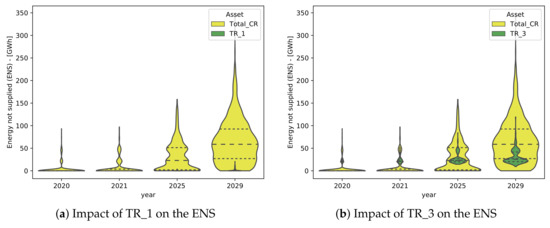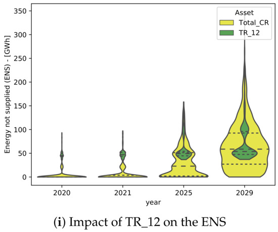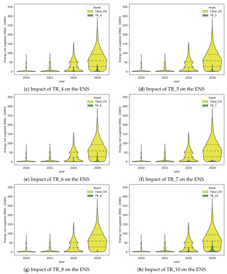 In order to assess the contribution of an asset failure in the entire risk of the whole power system, violin plots are performed as shown in Figure 10. In these plots, the cumulative expected ENS associated with each transformer failure is compared with the cumulative ENS of the fleet during the assumed periods of planning.