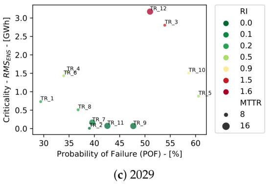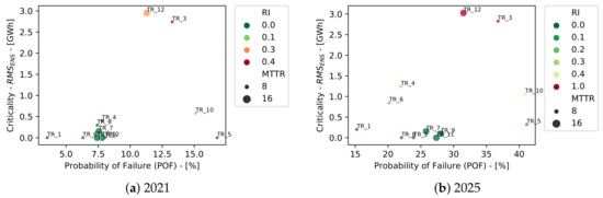 Figure 11 shows the predicted risk matrix of the transformer fleet during each year of the periods of planning assumed. The criticality for each transformer was assumed as the root mean square of the ENS associated with its failure. The size of the circles represent the MTTR assumed for each asset, and the color represents the risk index.