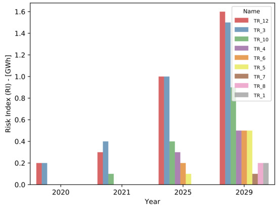 Finally, Figure 12 shows the risk index using a Pareto ranking during the assumed periods of planning. Only the assets with by ENS are shown. Here, it can be appreciated that the transformers TR_3 and TR_12 present the highest risk. On the one hand, it is estimated that the TR_5 shows the highest risk increase by ENS, and on the other hand, the TR_7 presents the lowest increase. These types of analyses can be used to support decision making. For instance, in the year 2021, the prioritized decision over the fleet should be related to TR_3 and TR_12. Subsequently, in the year 2025, the prioritized transformers should be TR_10, TR_4, and TR_6. This decision making must consider budgetary constraints as well as a positive opportunity. The opportunity is measured as the risk reduction monetized to carried out the decision minus the cost of it.