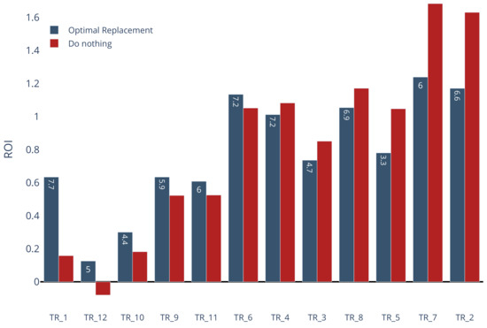 The optimal replacement time for the entire fleet compared with not replacing the asset is shown in Figure 13. According to the results, here, it can be appreciated that the highest benefit is replacing the TR_1 in the year 7.7. This decision is a result of the associated legal impact shown in Table 1, which is the highest of the fleet. A similar assessment is done for the transformer TR_10. The second decision with the best benefit is related to transformer TR_12, because this asset has both a high criticality by ENS and a poor condition. In other words, it presents a high risk index as can be appreciated in Figure 12. For TR_12, the result of not replacing it (do nothing) is a negative ROI. The next decisions with a positive benefit are changing the assets TR_9, TR_11, and TR_6 at years 5.9, 6, and 7.3, respectively. For the rest of the assets, the optimal decision is to do nothing and therefore assume taking the risk. The benefit is assumed as the difference between ROI of the optimal replacement time and the ROI of the do nothing decision.