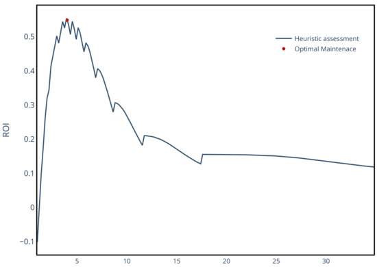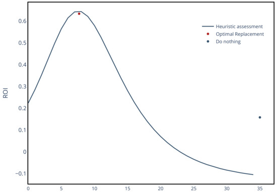 To illustrate the influence of replacement on , Figure 14 shows the for the decision with the highest benefit (TR_1) considering different replacement times. Here, it can be appreciated how an early or late replacement significantly impacts the return of investment. The point at time 35 refers to the decision to do nothing.
