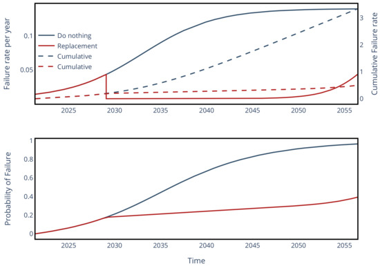 where is the time when the asset is replaced. To estimate the influence of replacement in the RI with Equation (7), the cumulative failure rate can be expressed as follows:
