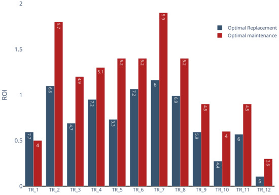 In order to enhance the decision-making process, an optimal maintenance strategy must be estimated. In this paper, the strategy considers a constant frequency of maintenance seeking to obtain the maximum ROI at the end of life of the asset. In this case, for the assessment, a strategy by which the health index is held below 0.2 after each major maintenance is assumed. In other words, the maintenance has a direct impact on the HI. In Figure 16, the comparison between replacement and maintenance strategies under the assumed conditions is shown, where bar numbers mean the optimal replacement time and frequency of maintenance, respectively. Here it can be appreciated that the optimal decision for TR_1 is replacing the asset in the year 7.7 instead of performing maintenance every 4 years. For the rest of the assets, a higher ROI is obtained with maintenance instead of replacing. It is worth emphasizing that the transformer with the lowest maintenance interval is the TR_12, which is a consequence of its poor condition and high failure impact.