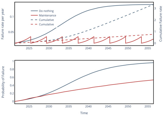 where is the maintenance cost, N is the amount of maintenance during the asset life, and a constant maintenance period T equivalent to the time between maintenance tasks is assumed. To assume constant T, the planning of maintenance in a medium large time is simplified. Hence, the influence of maintenance in the cumulative failure rate is given by