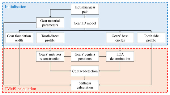 Figure 1 represents the overall flowchart of the TVMS evaluation method proposed in this study. The gears used in this investigation are industrial KHK gears of references: KHK SS2-29/KHK SS2-36 (these two gears were chosen because we have them in our laboratory, so we can verify the extracted geometry by the real gears, but the developed method is applicable for any type of gear). In the initialization part of this method, the gear 3D models downloaded from the constructor website are incorporated in a computer-aided design software to extract the gear teeth geometric features (the tooth profile, the tooth width variation, etc.). These features are used then to reconstruct the gear matrices as explained in Section 2.1.1. In the calculation part or the dynamic part of this flowchart, these matrices are transformed at each simulation step to adjust the position and the angular rotation of their centers; then, the corresponding LOA equation is defined and swept to detect contact points at every iteration. Finally, these points are used to calculate the stiffness at this iteration using Equations (1)–(5) and the angular position of the pinion is incremented for the next iteration. The TVMS evaluation steps are described in more detail in the following subsections.