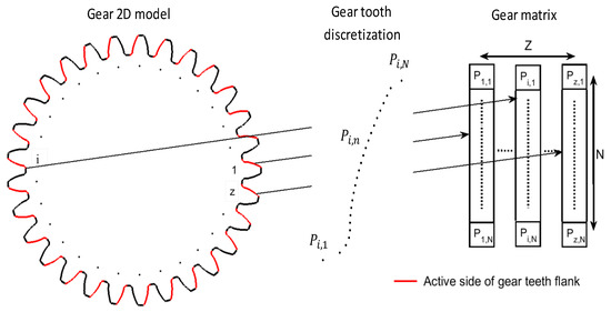 Each gear is modeled with an matrix as illustrated in Figure 2, where N represents the sampling rate of the chosen gear tooth profile and Z represents the number of gear teeth. Every cell of this matrix contains the coordinates of the nth point of the zth tooth profile as shown in Figure 2. We should note here that only the active side of the gear teeth is considered in this representation.