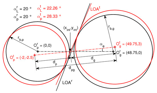 As shown in Figure 4, only the gear base circles and centers are required to define the corresponding LOA. Algorithm 1 details the steps followed for the determination of the LOA for varying positions of gear centers: